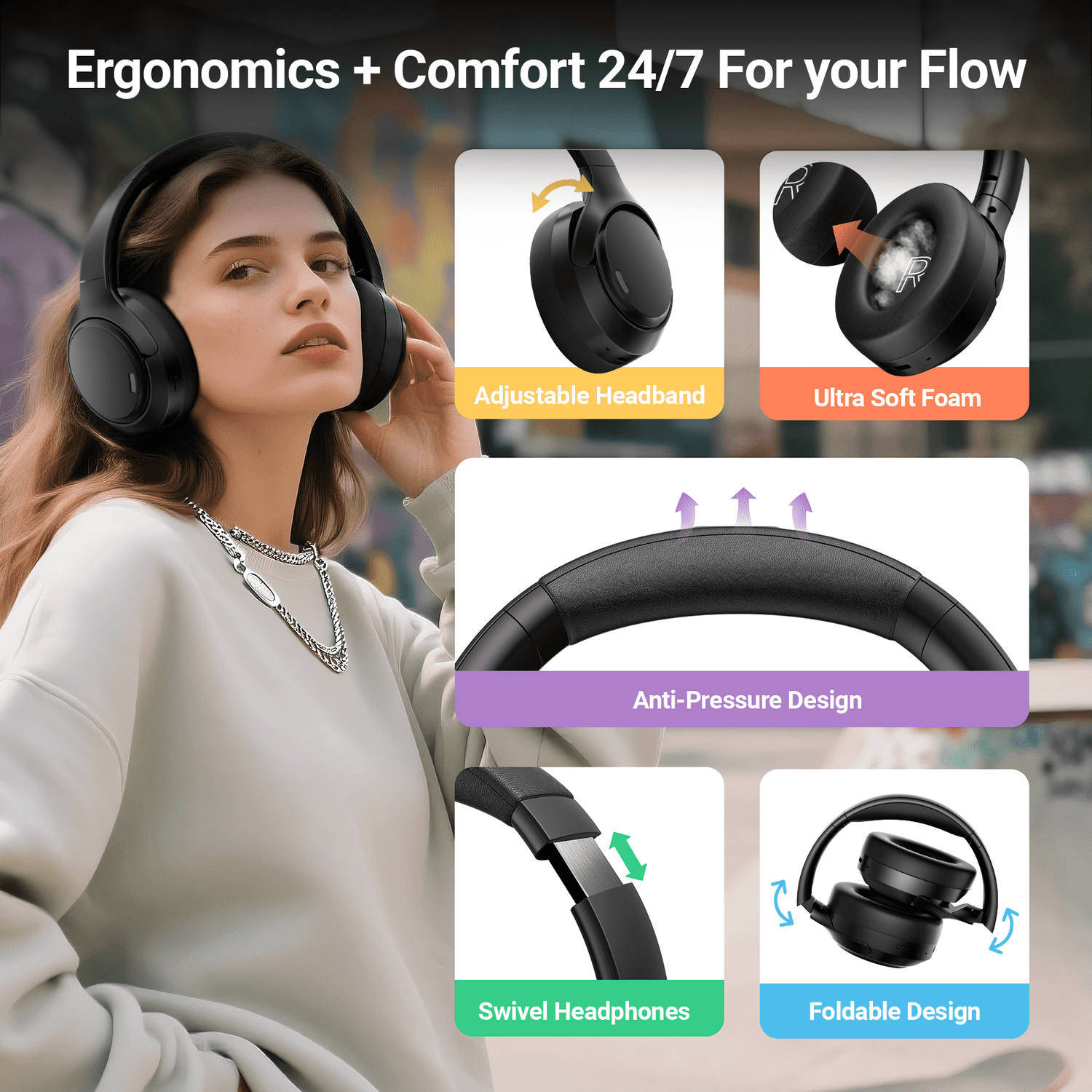 - 【6-Mic ENC Calls & 360° Spatial Sound】:Equipped 6 adaptive ENC mics, the A18 noise cancelling headphones ensure face-to-face call clarity even in noisy streets, cafes, or open offices by cancelling traffic, wind, and crowd noise. Combined with 40mm dynamic drivers and immersive 360° spatial audio, sound that surrounds you, flowing naturally in every direction. Just lose yourself in the music.